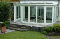 Wintergartenreinigung je nach Material mit sanftem Hochdruckstrahl, Dampfreiniger und Fensterreinigungsgerät. |